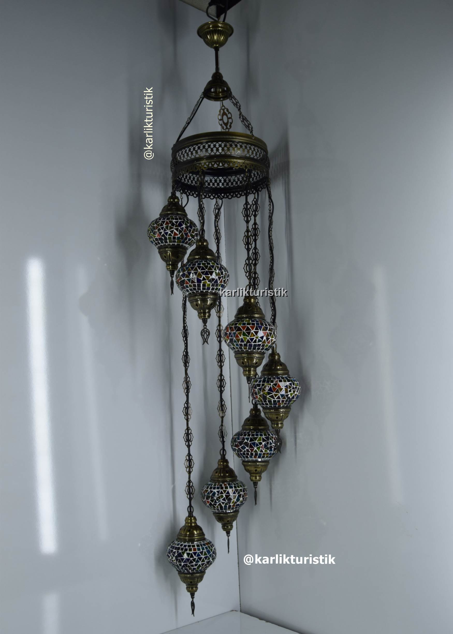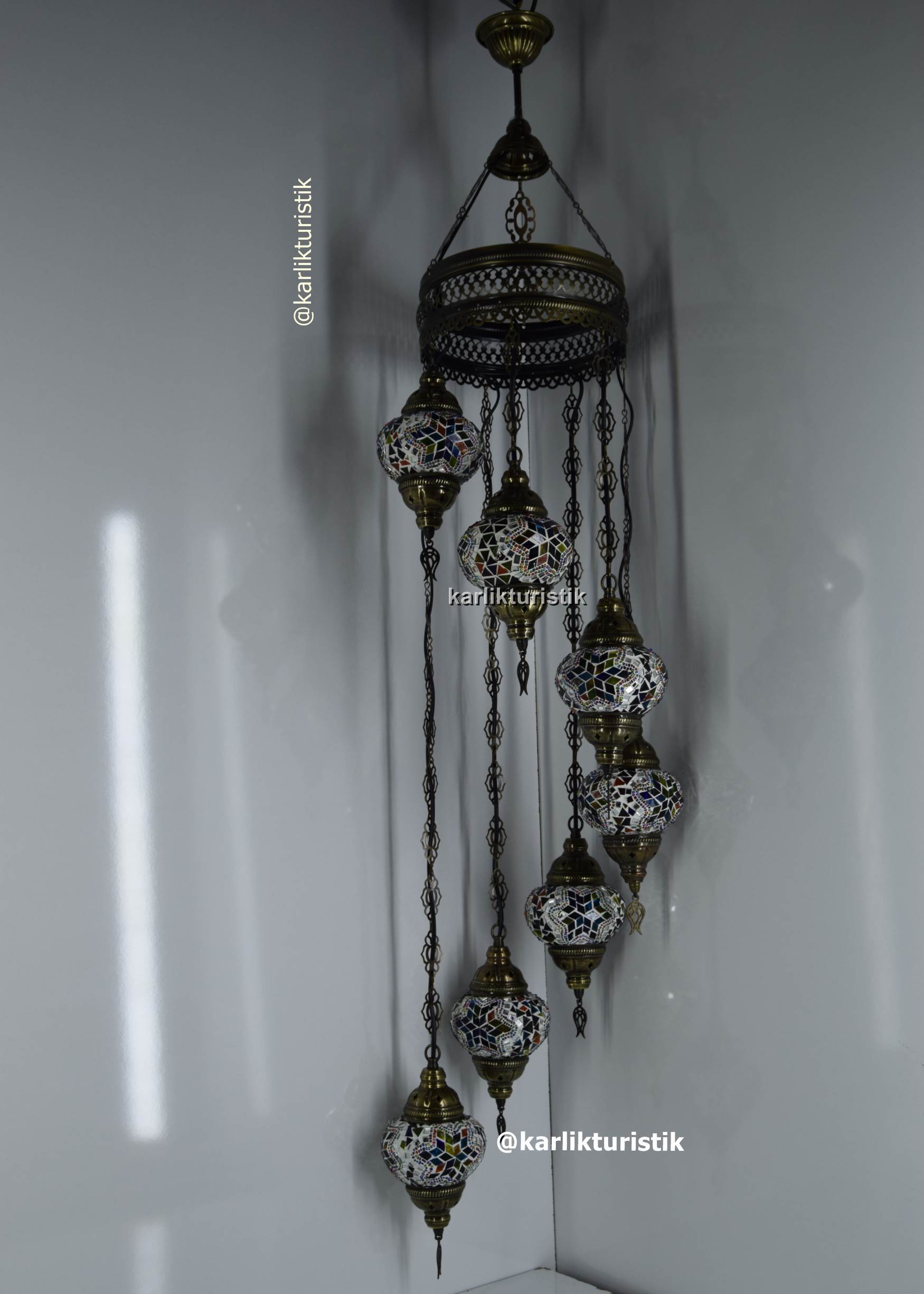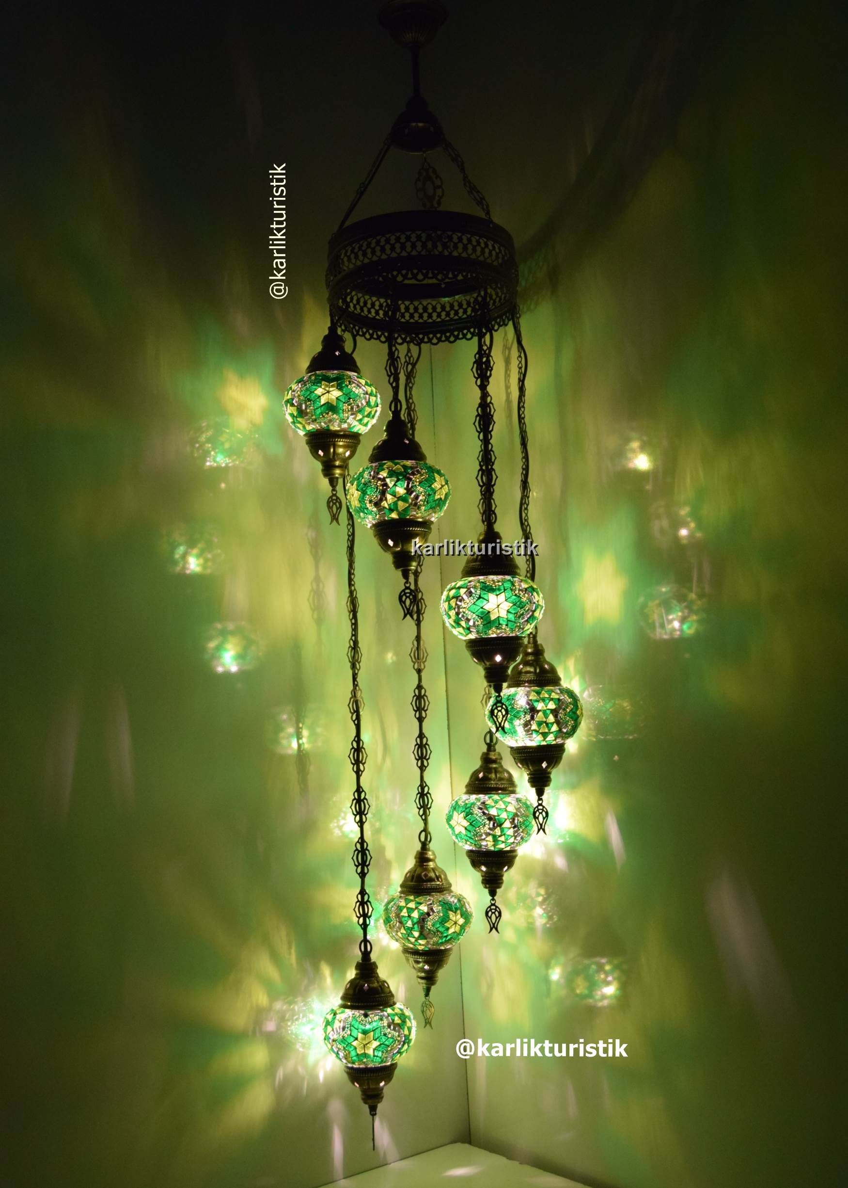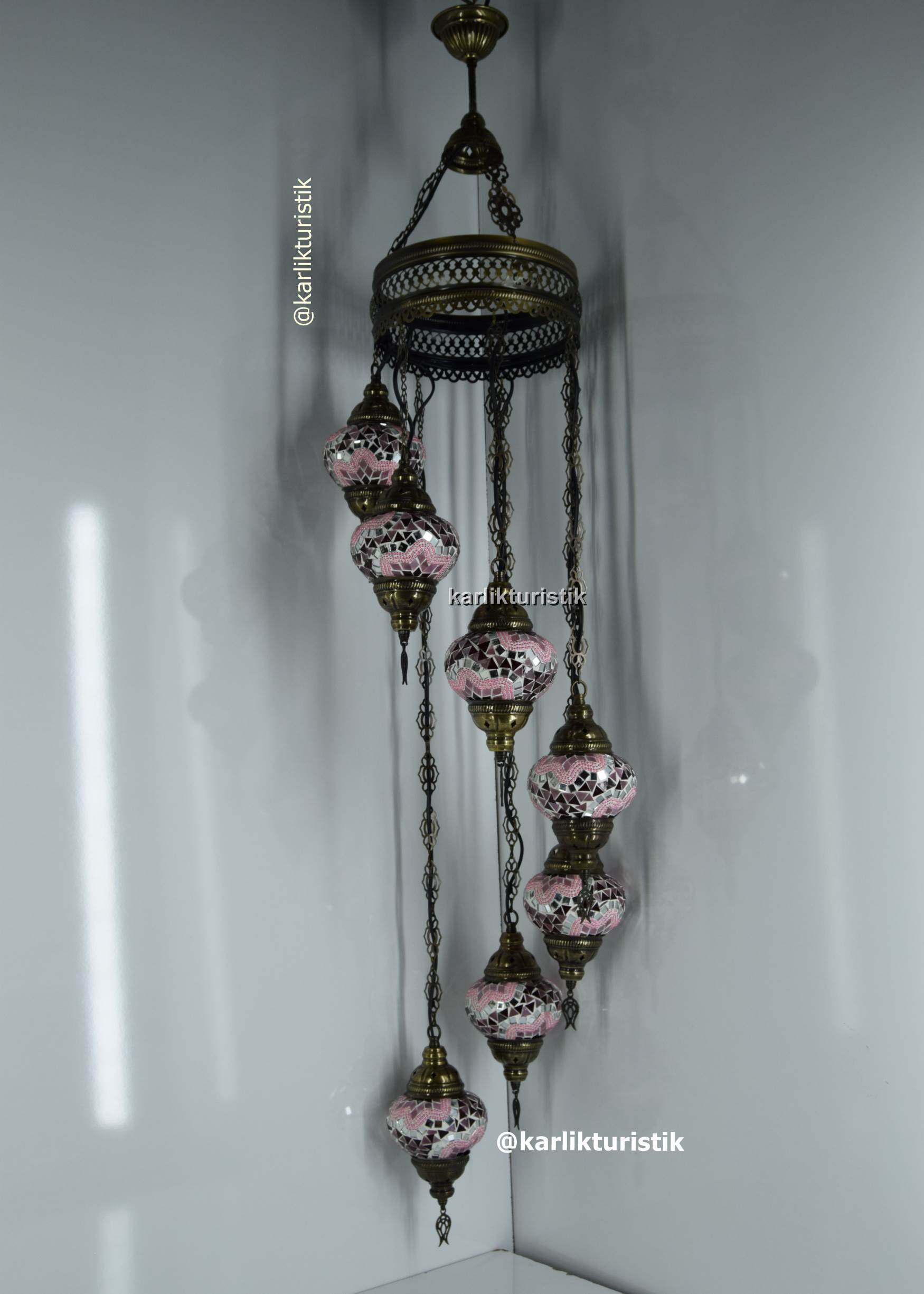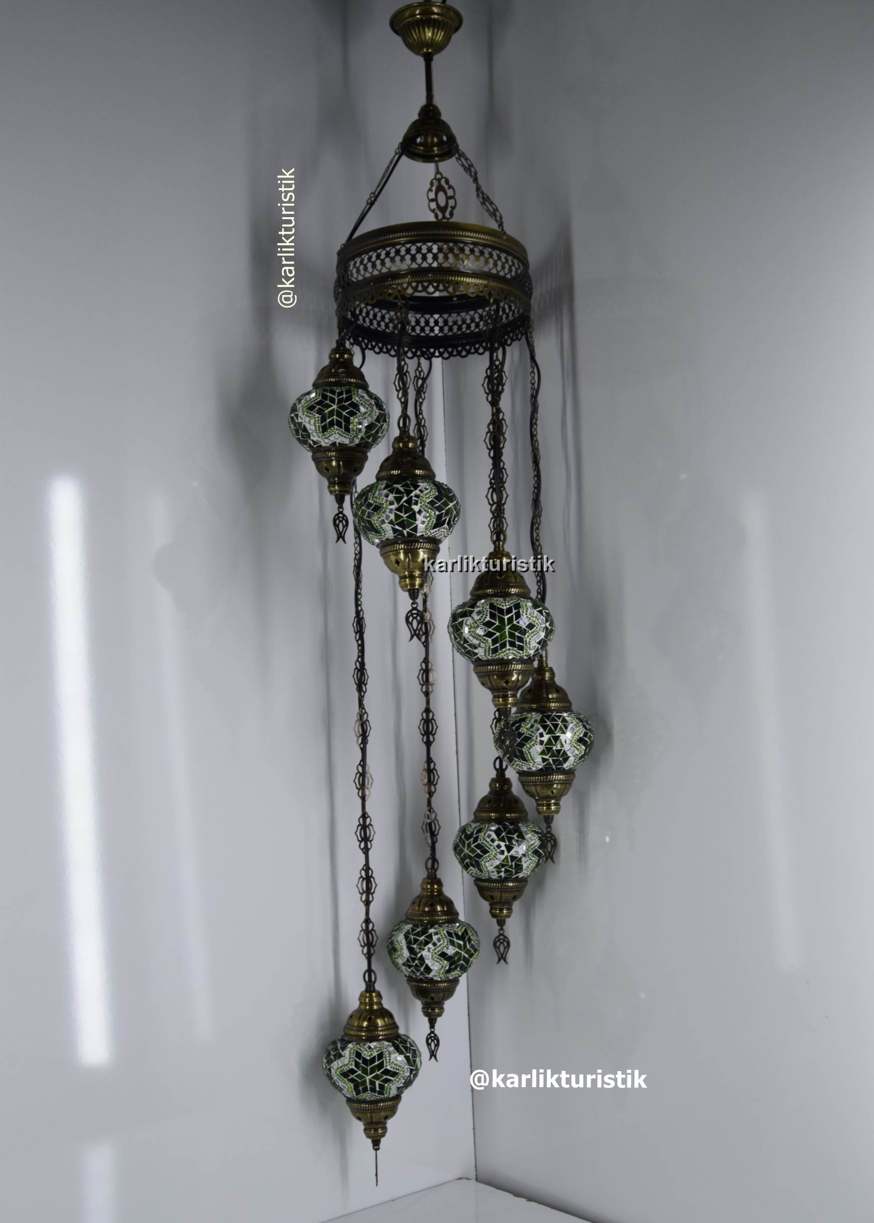 Türk Lambası 7 li mozaik camlı Tasarım avize, Türk Lambası Tavan Aydınlatması , Mozaik Lamba Askılı, Moracon Lamba, Türk Mozaik Tavan Avize Lambası I-S-C-5308
