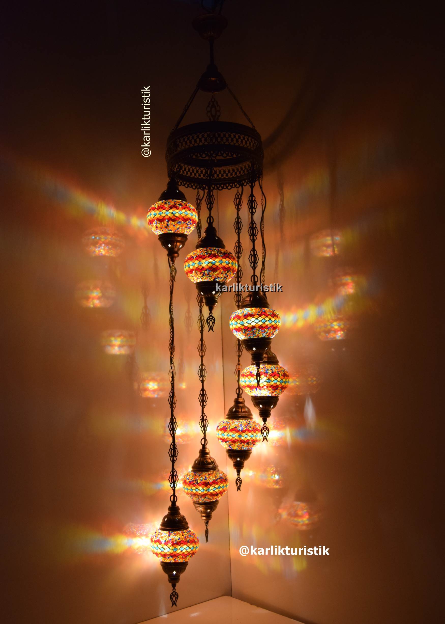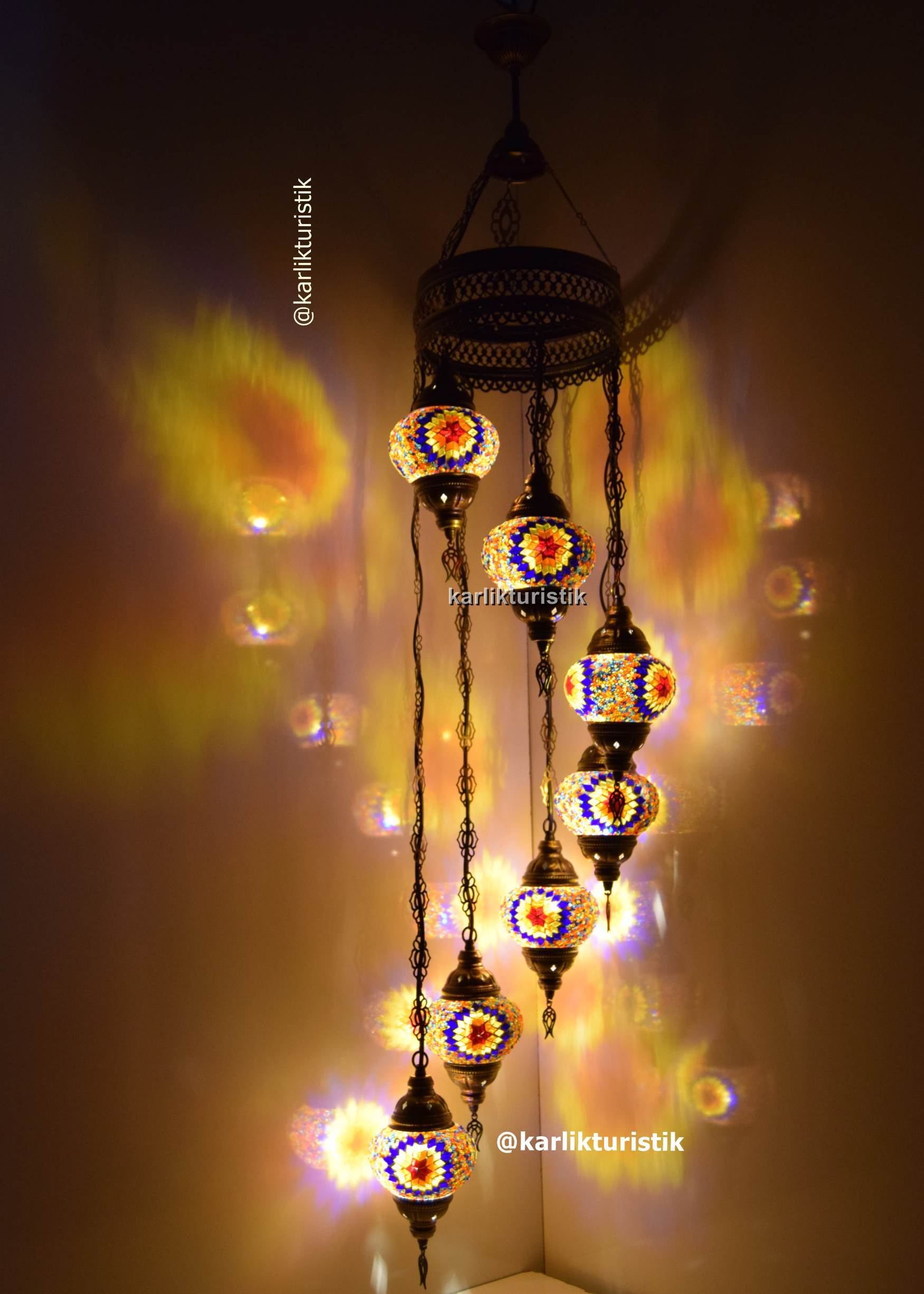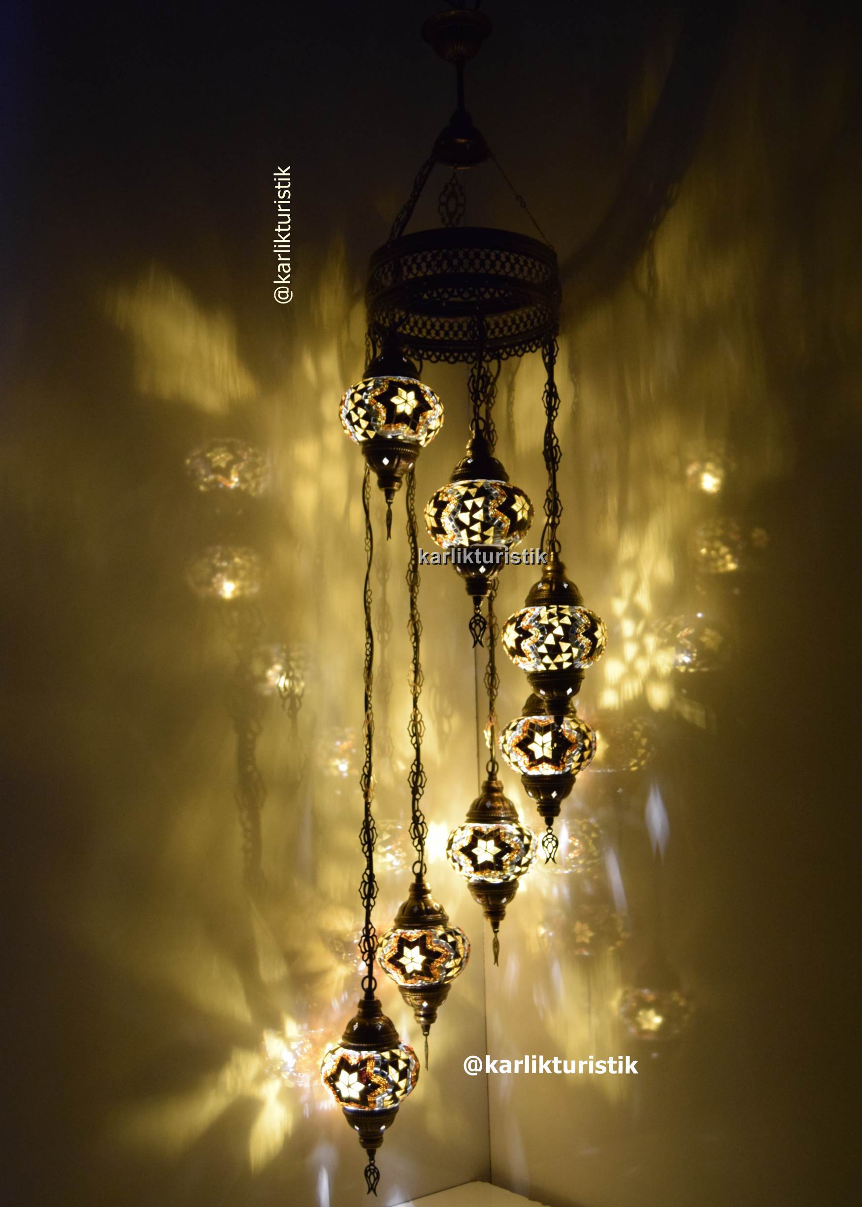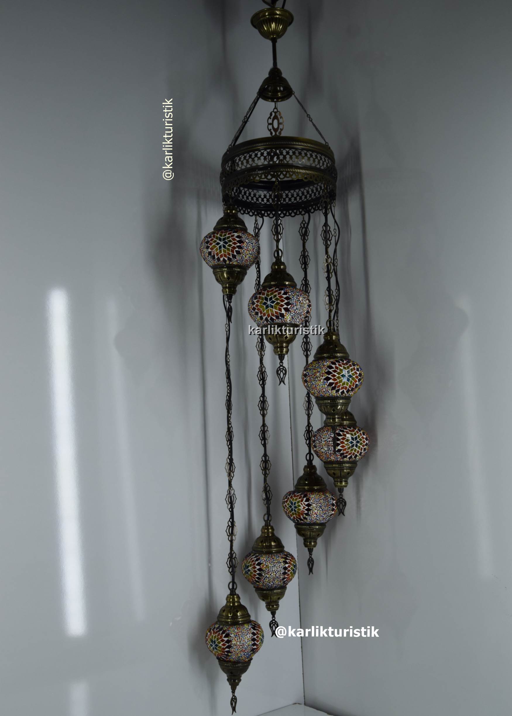 Türk Lambası 7 li mozaik camlı Tasarım avize, Türk Lambası Tavan Aydınlatması , Mozaik Lamba Askılı, Moracon Lamba, Türk Mozaik Tavan Avize Lambası I-S-C-5308