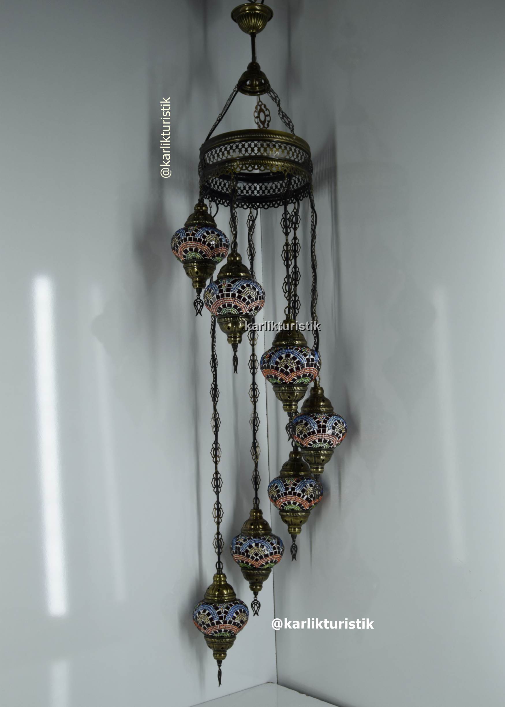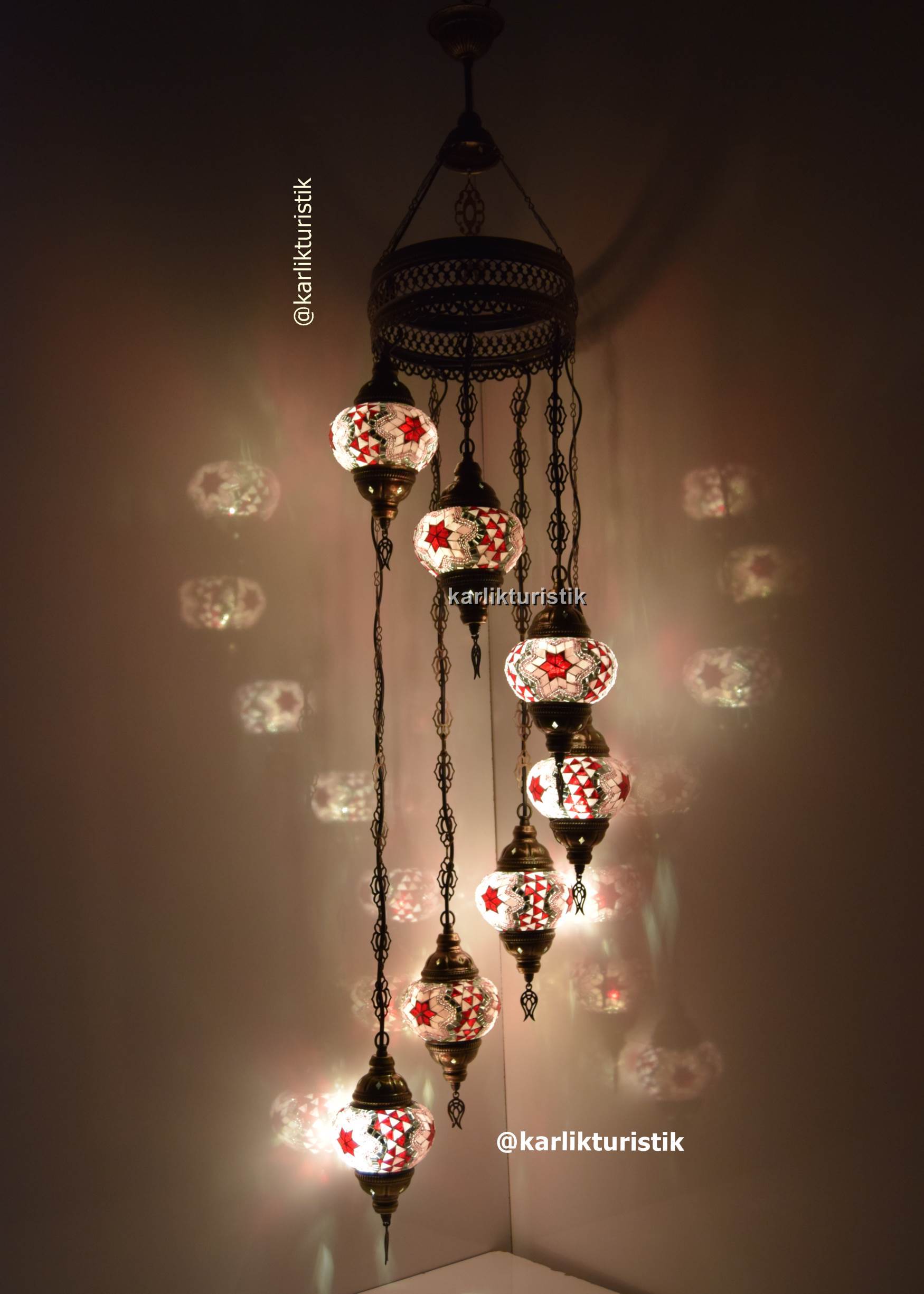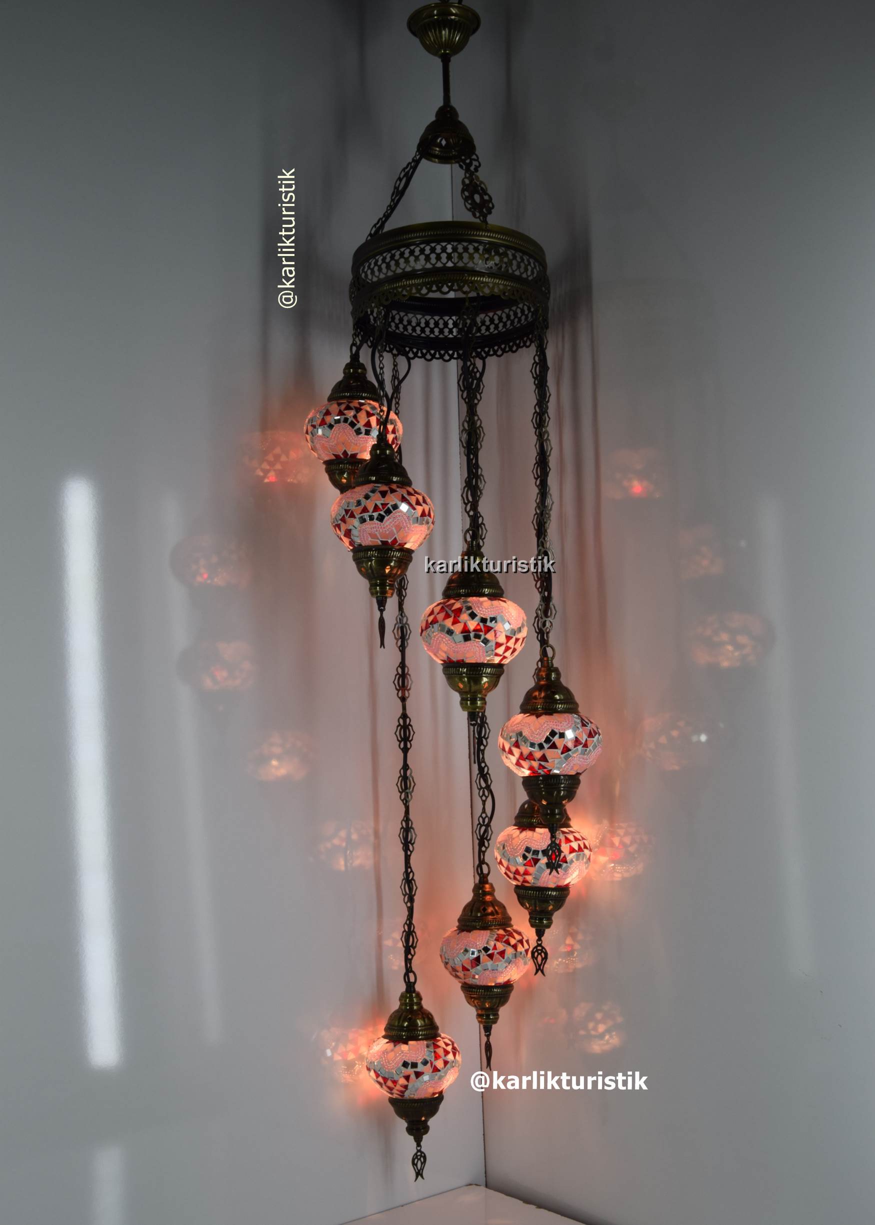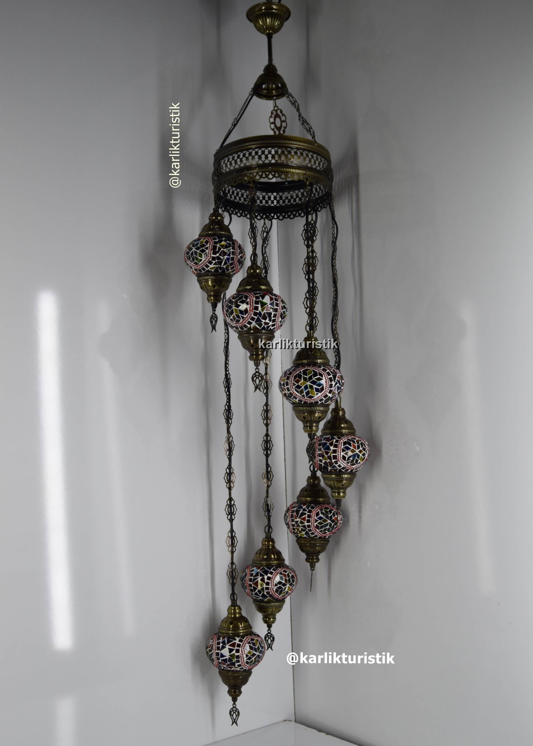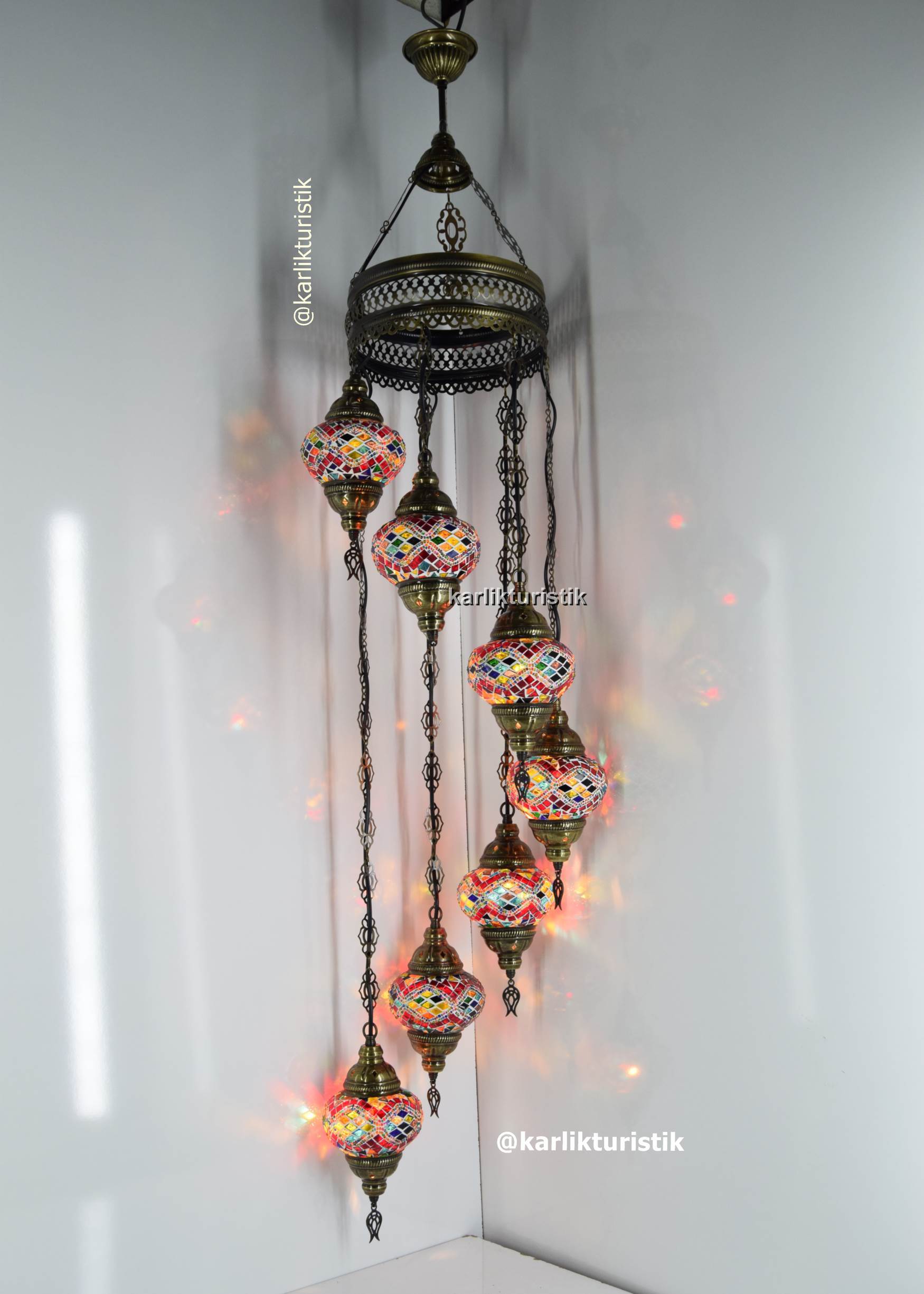 Türk Lambası 7 li mozaik camlı Tasarım avize, Türk Lambası Tavan Aydınlatması , Mozaik Lamba Askılı, Moracon Lamba, Türk Mozaik Tavan Avize Lambası I-S-C-5308