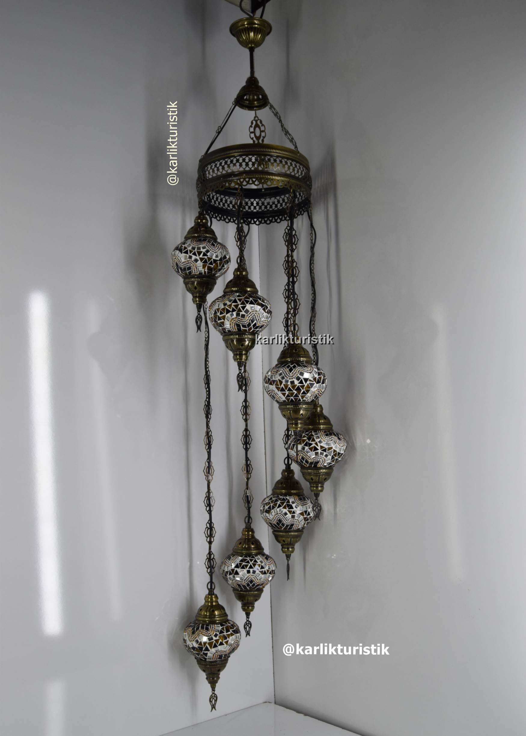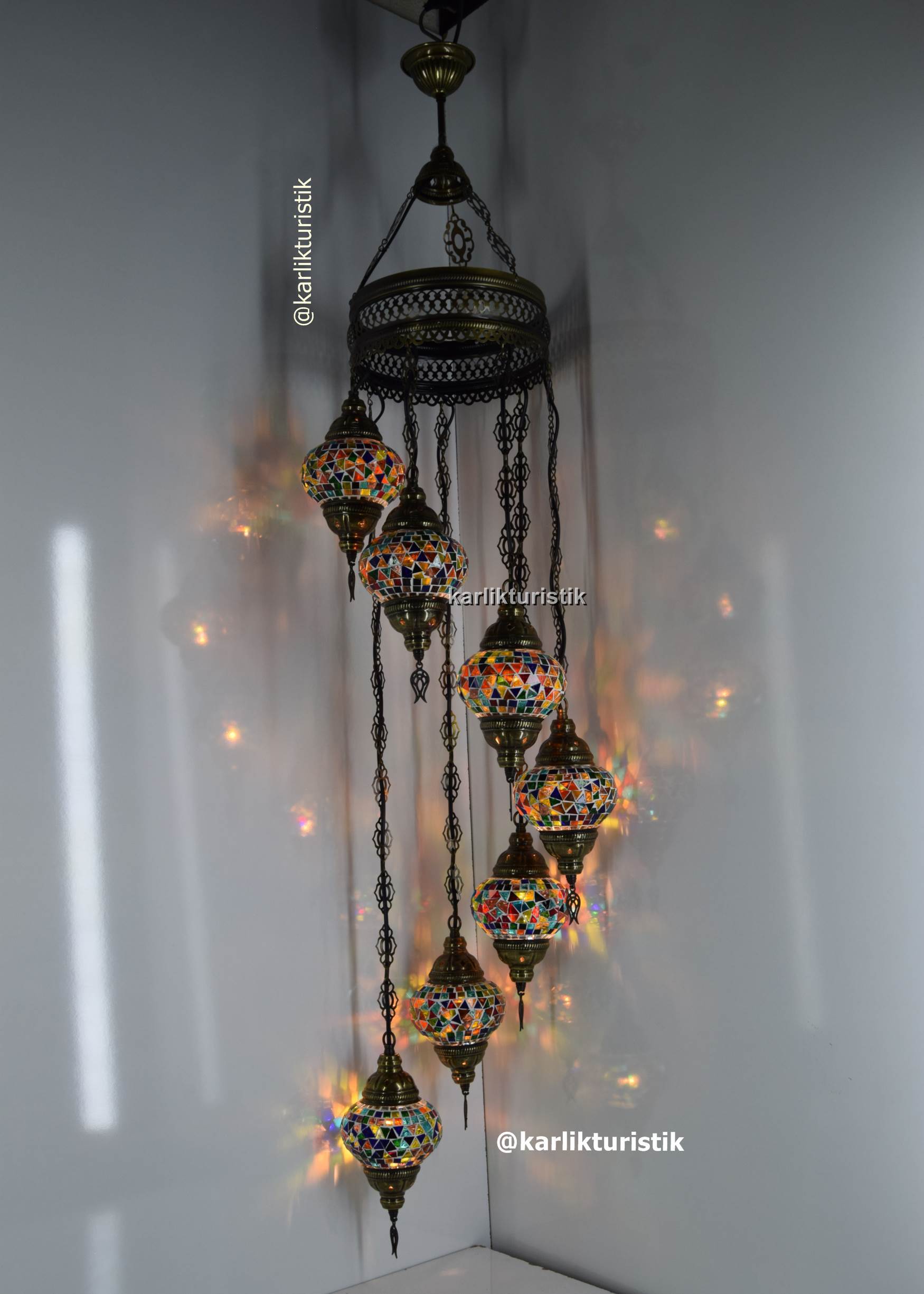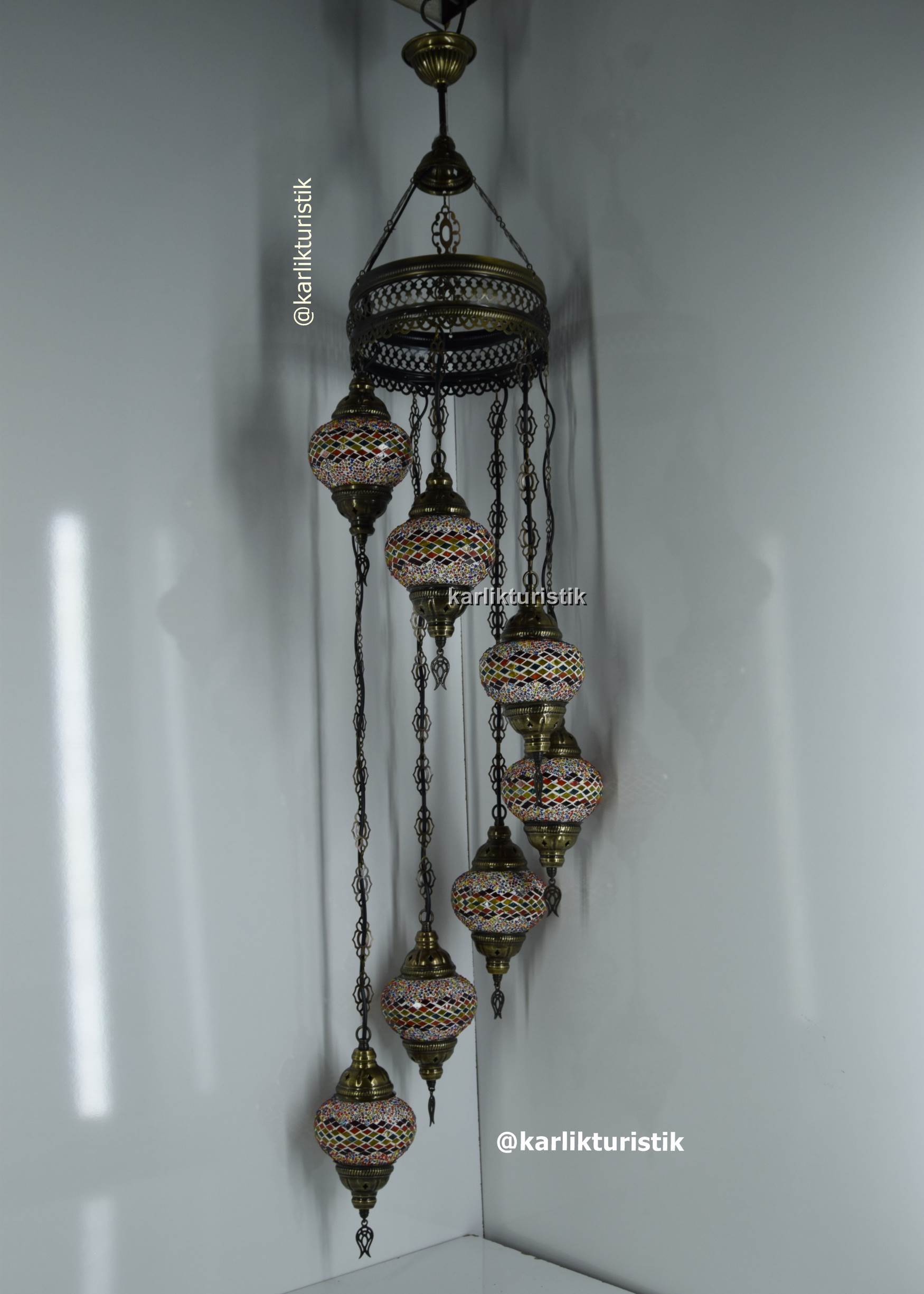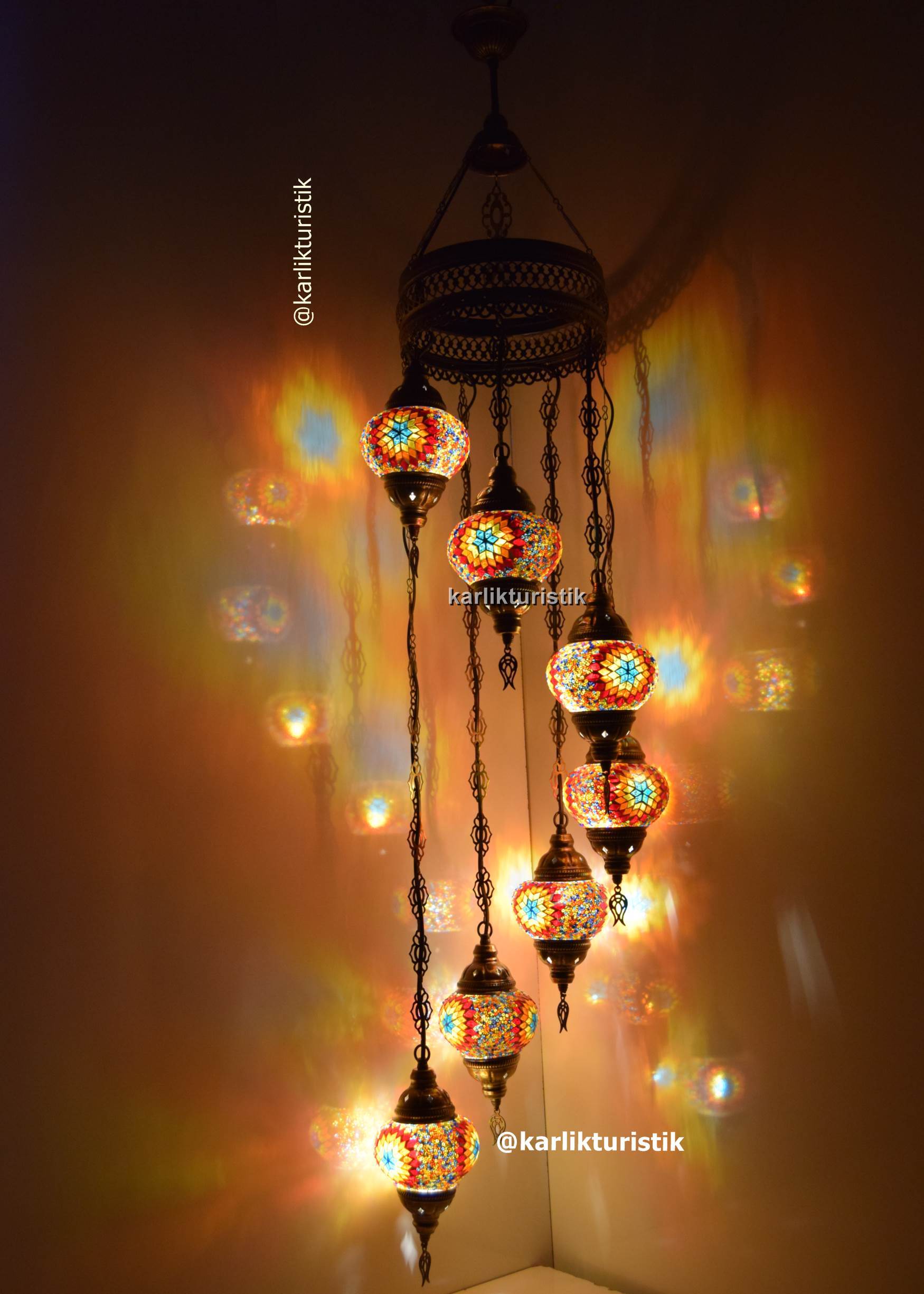 Türk Lambası 7 li mozaik camlı Tasarım avize, Türk Lambası Tavan Aydınlatması , Mozaik Lamba Askılı, Moracon Lamba, Türk Mozaik Tavan Avize Lambası I-S-C-5308