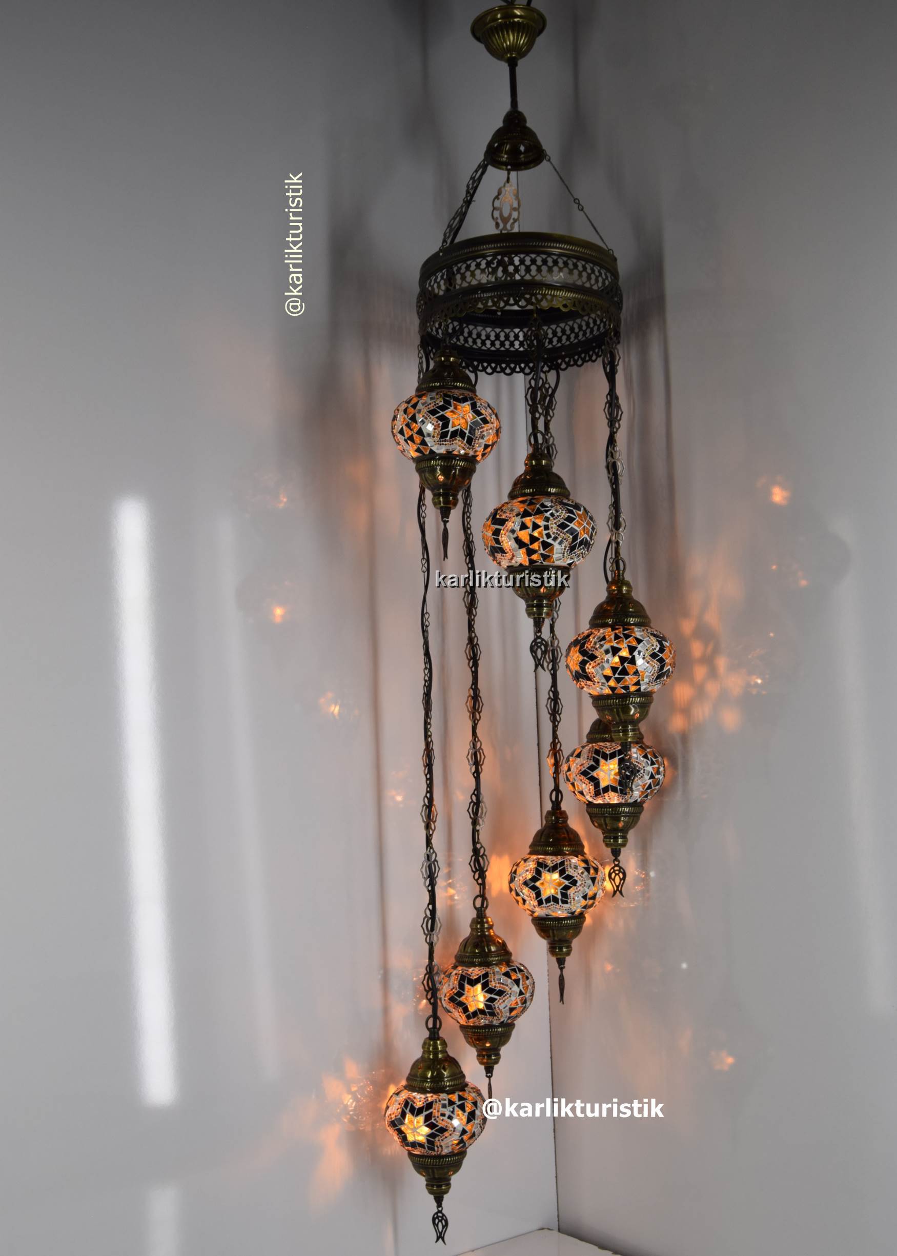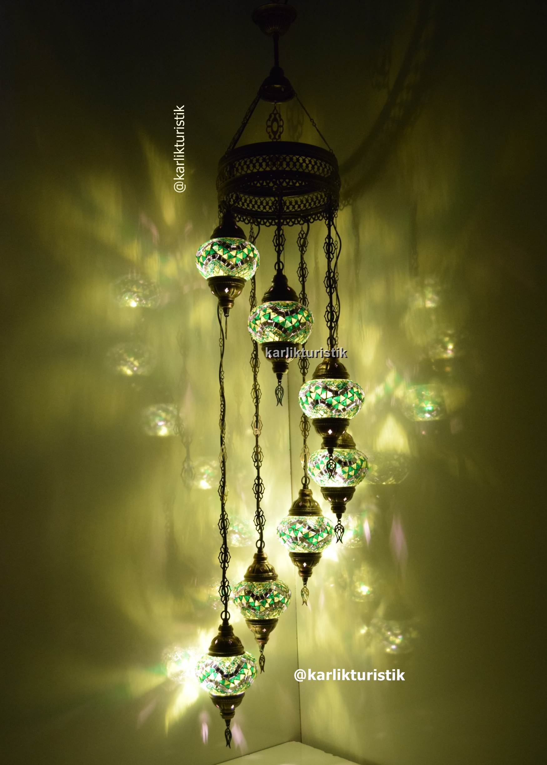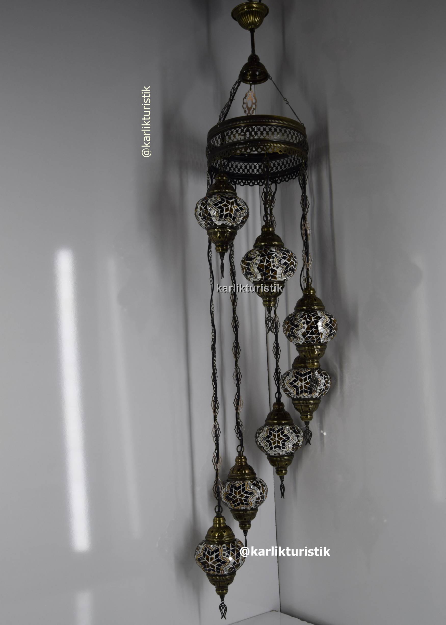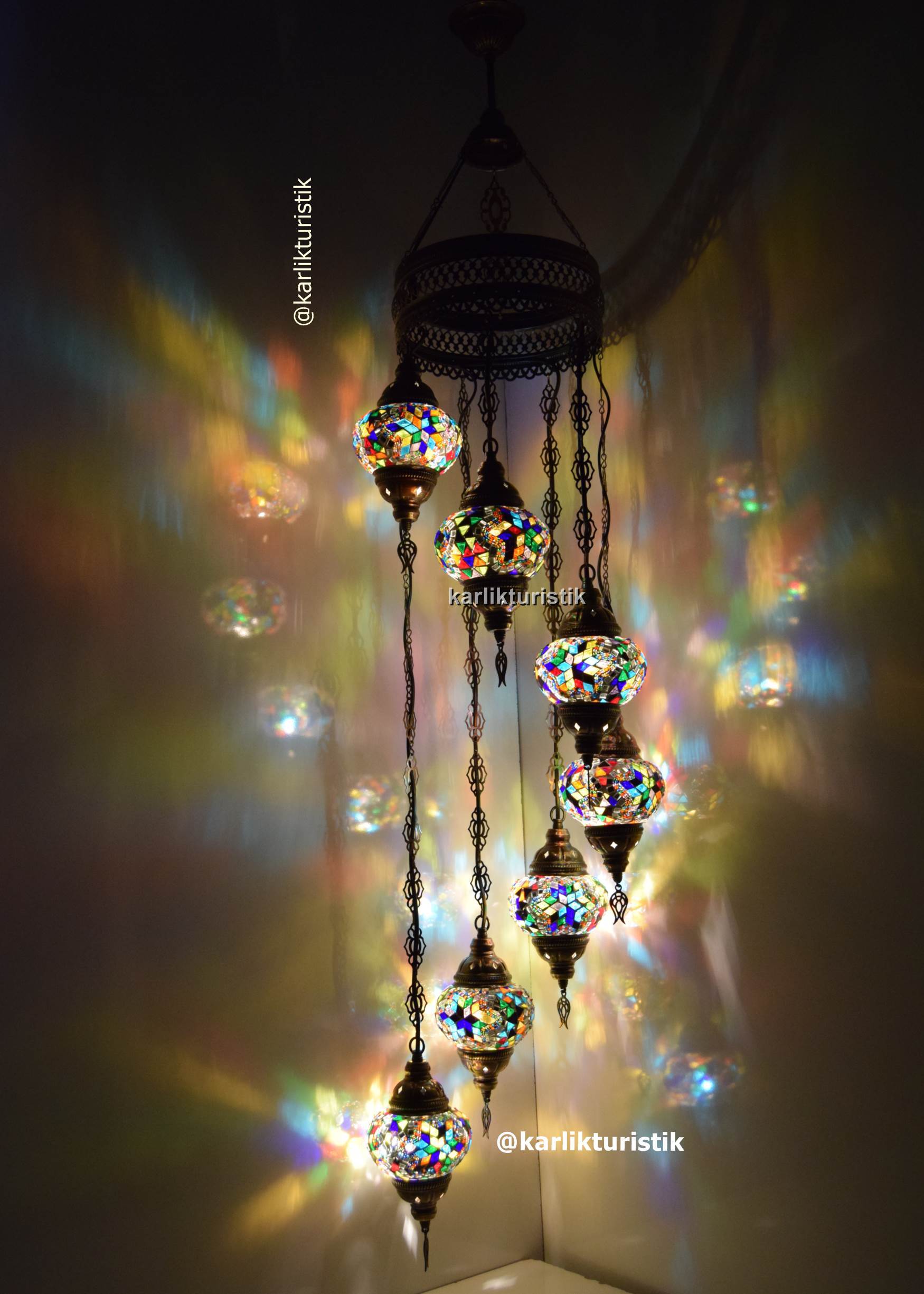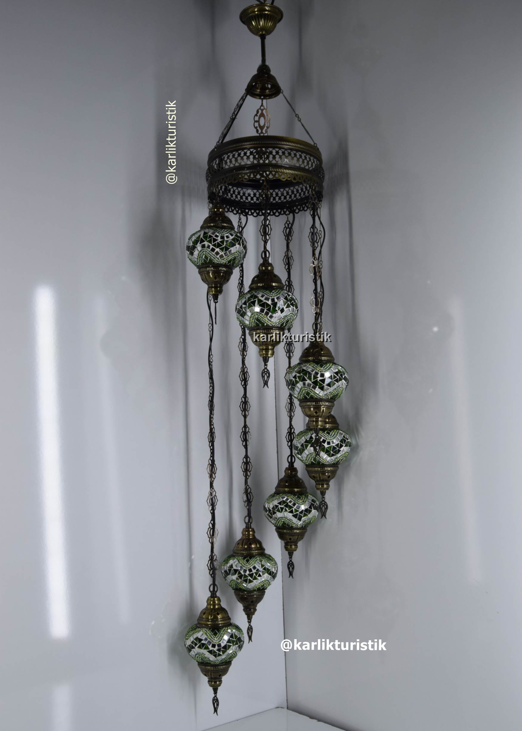 Türk Lambası 7 li mozaik camlı Tasarım avize, Türk Lambası Tavan Aydınlatması , Mozaik Lamba Askılı, Moracon Lamba, Türk Mozaik Tavan Avize Lambası I-S-C-5308