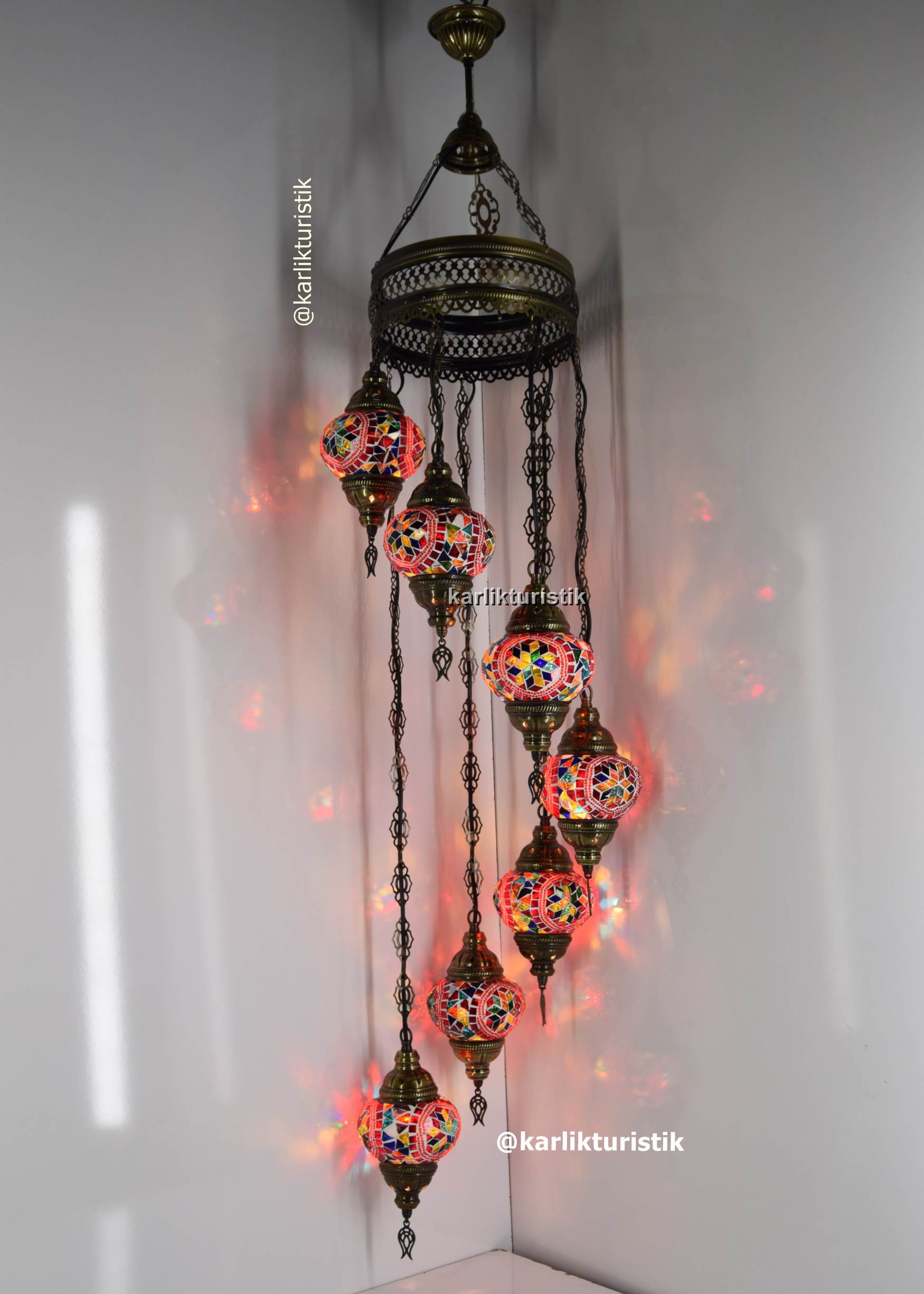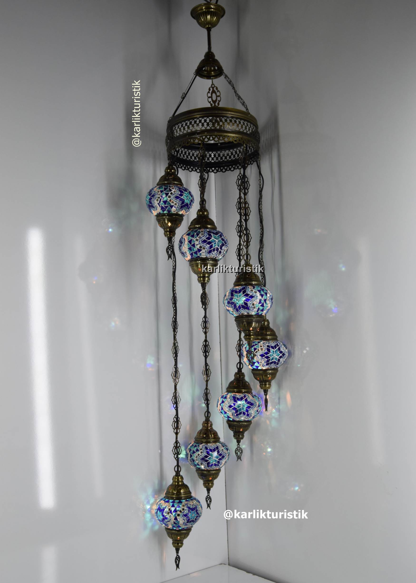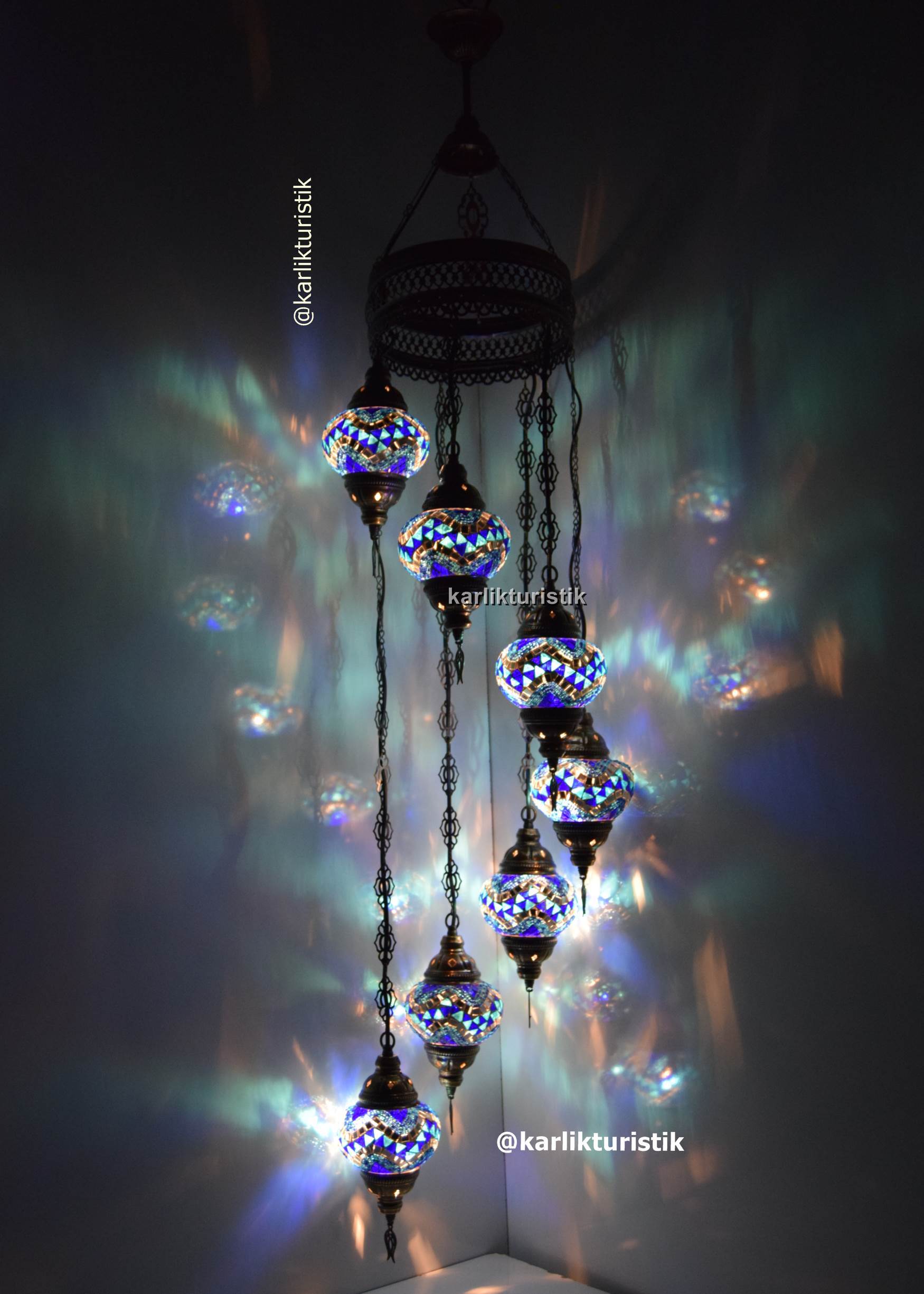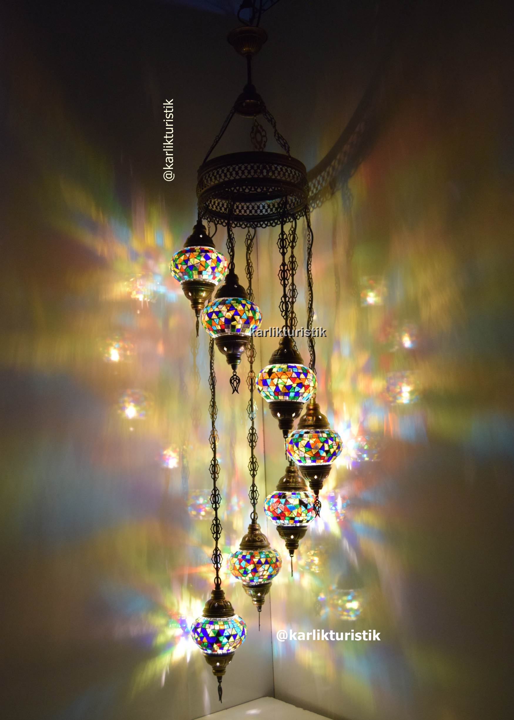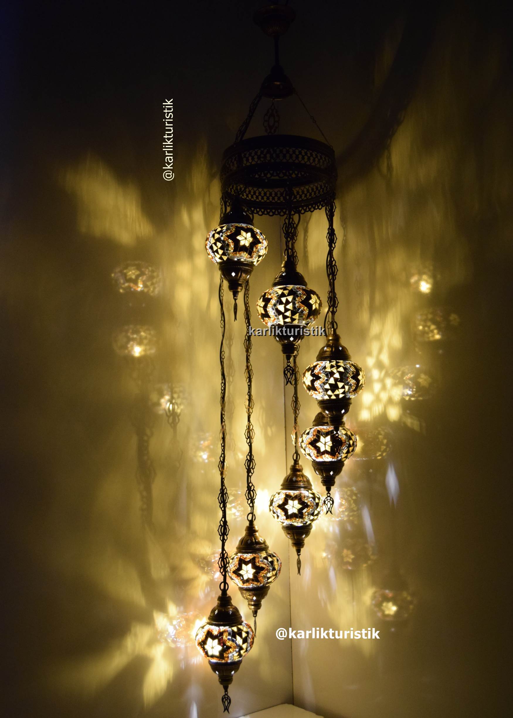Türk Lambası 7 li mozaik camlı Tasarım avize, Türk Lambası Tavan Aydınlatması , Mozaik Lamba Askılı, Moracon Lamba, Türk Mozaik Tavan Avize Lambası I-S-C-5308