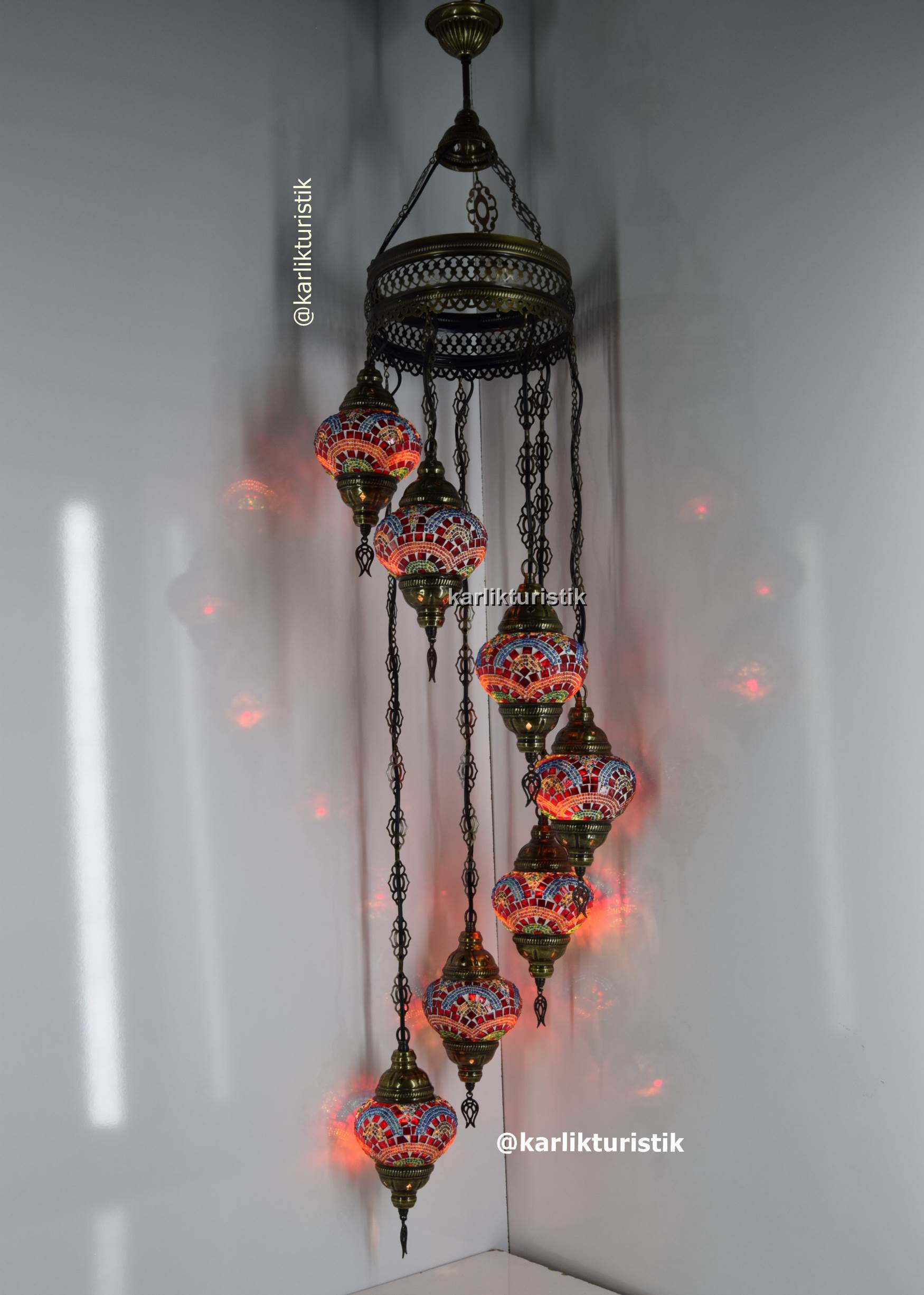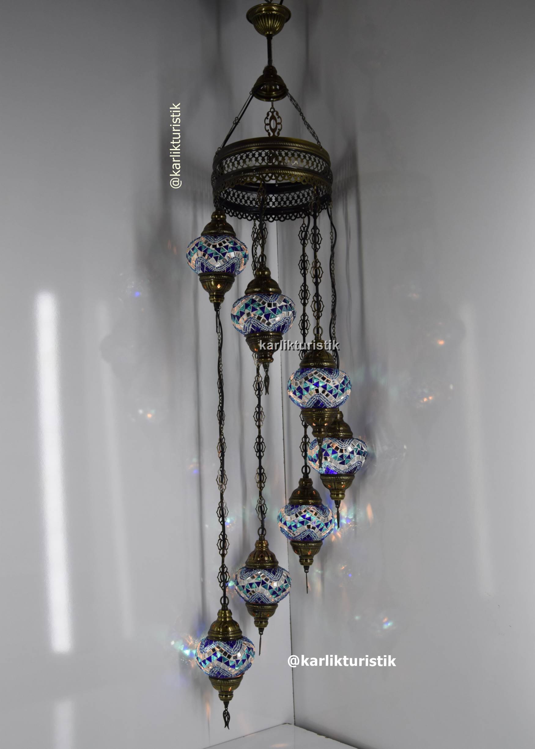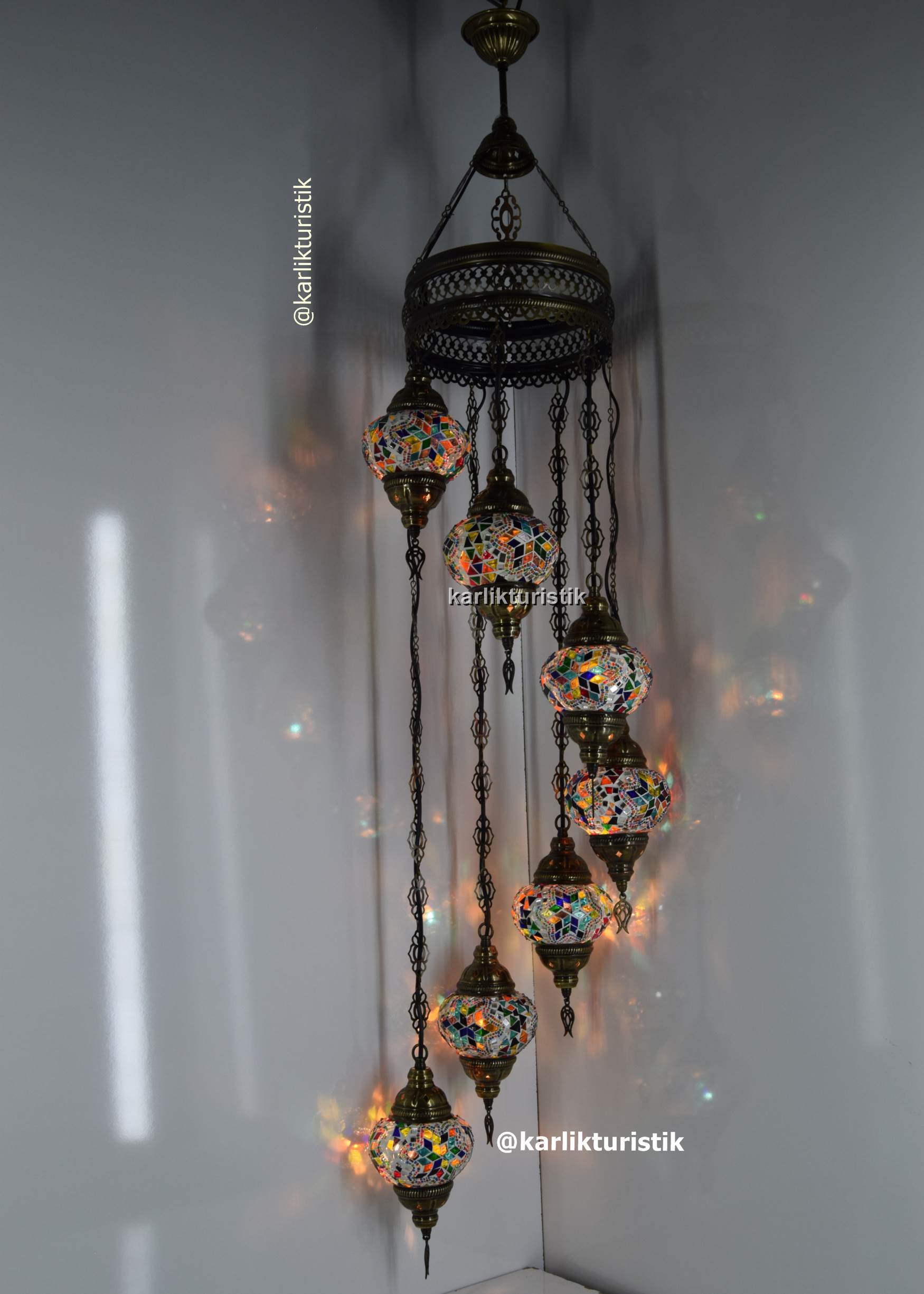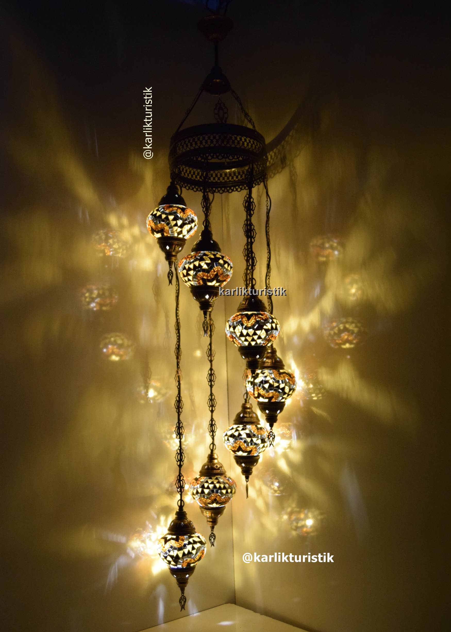 Türk Lambası 7 li mozaik camlı Tasarım avize, Türk Lambası Tavan Aydınlatması , Mozaik Lamba Askılı, Moracon Lamba, Türk Mozaik Tavan Avize Lambası I-S-C-5308
