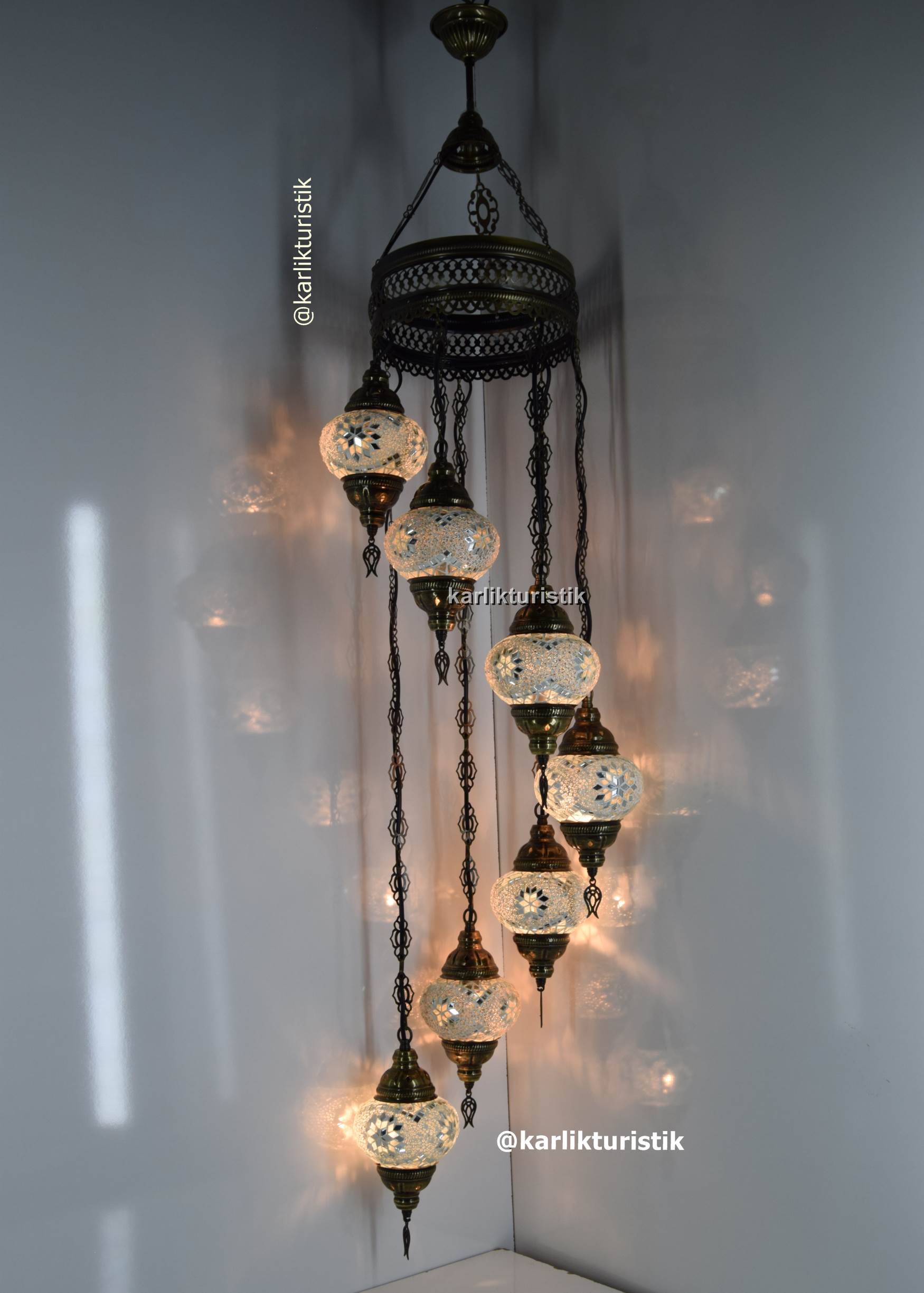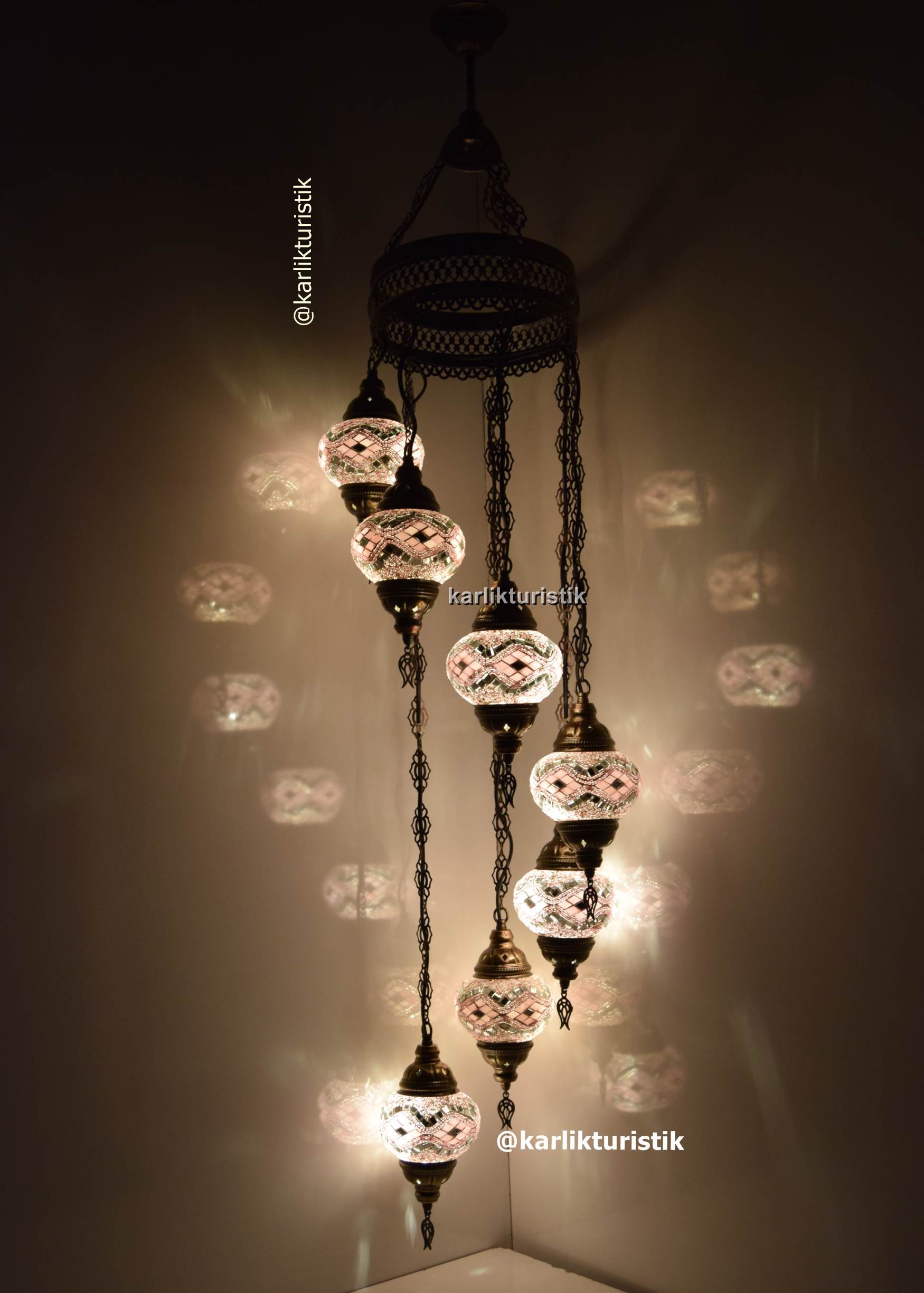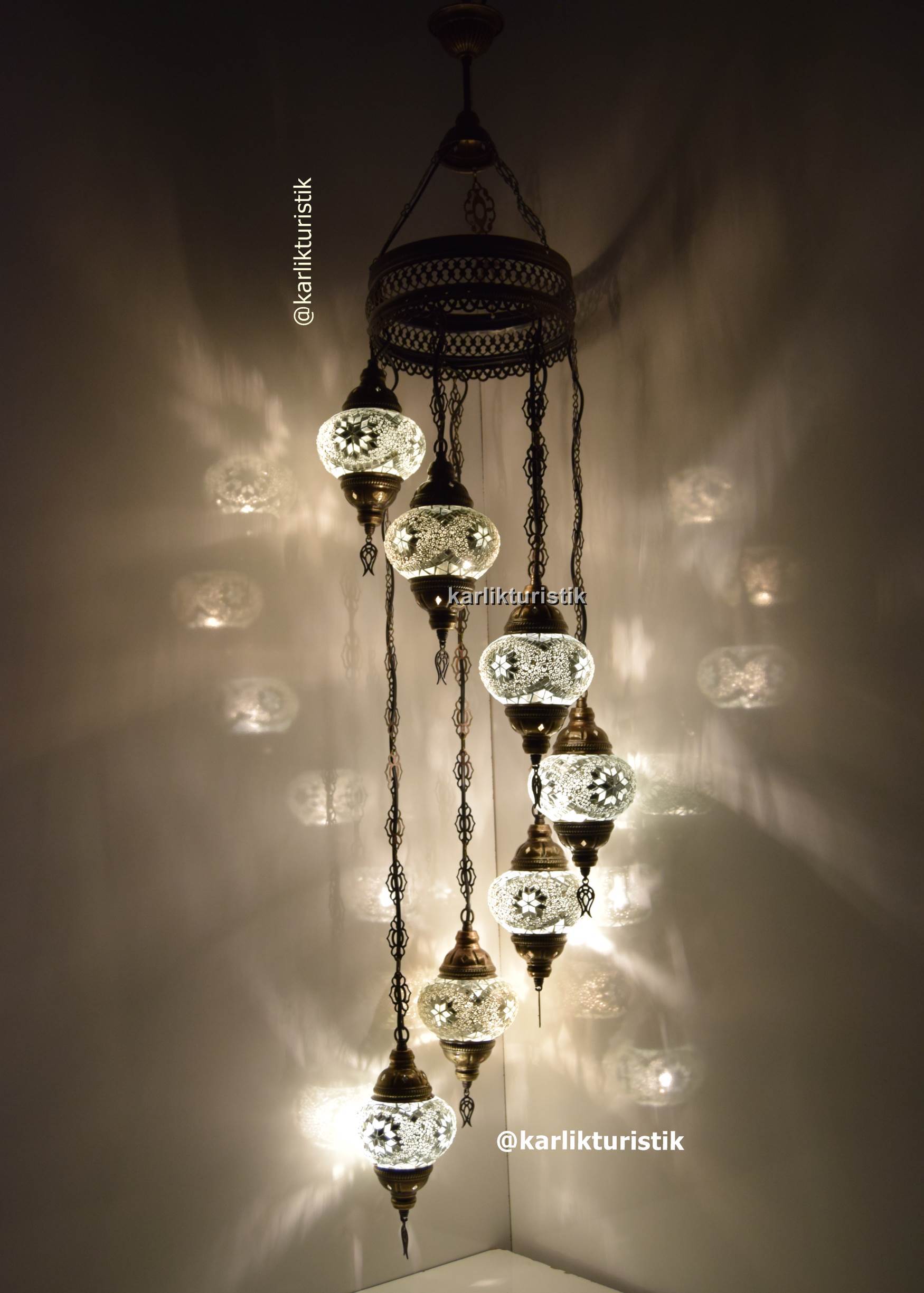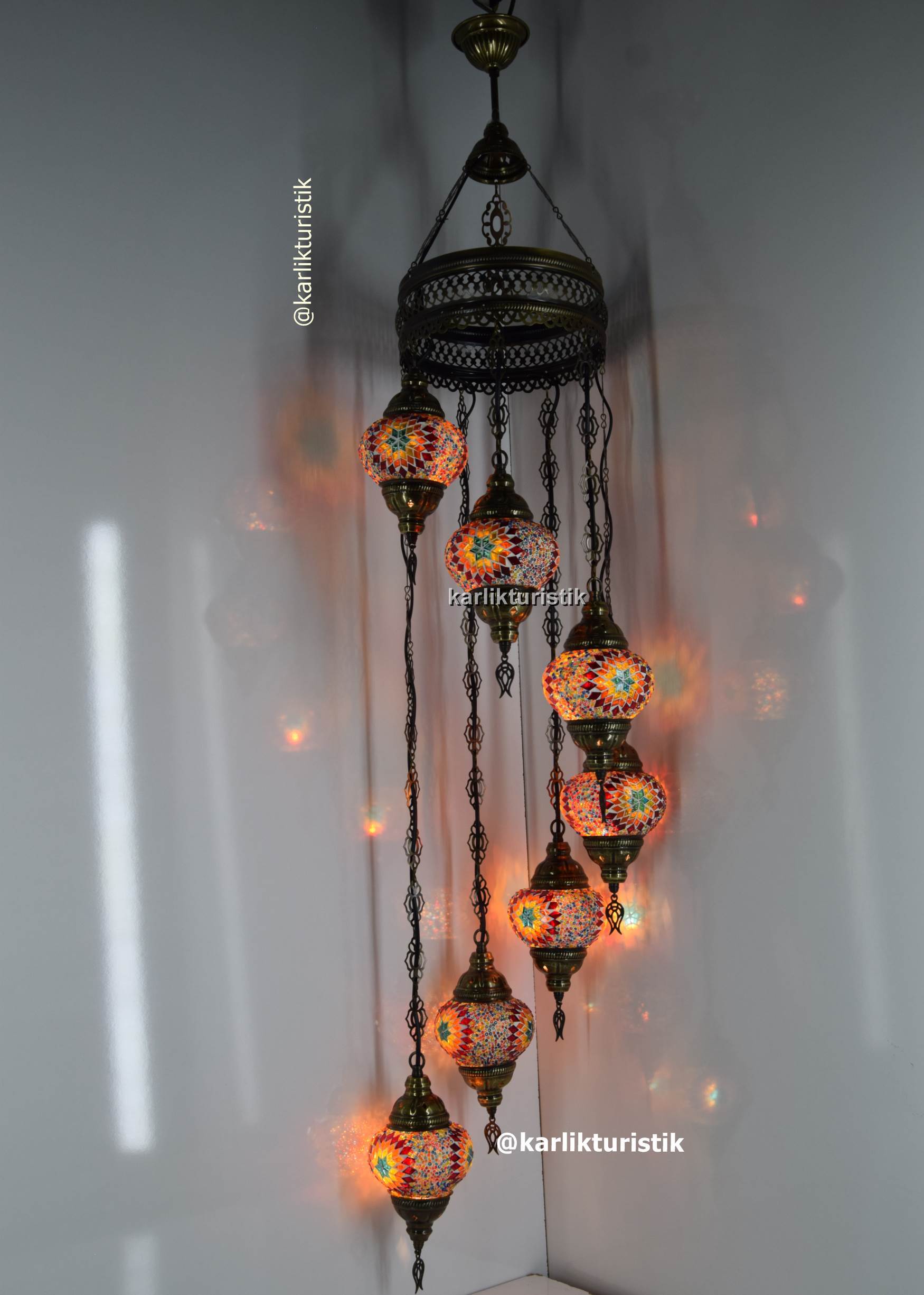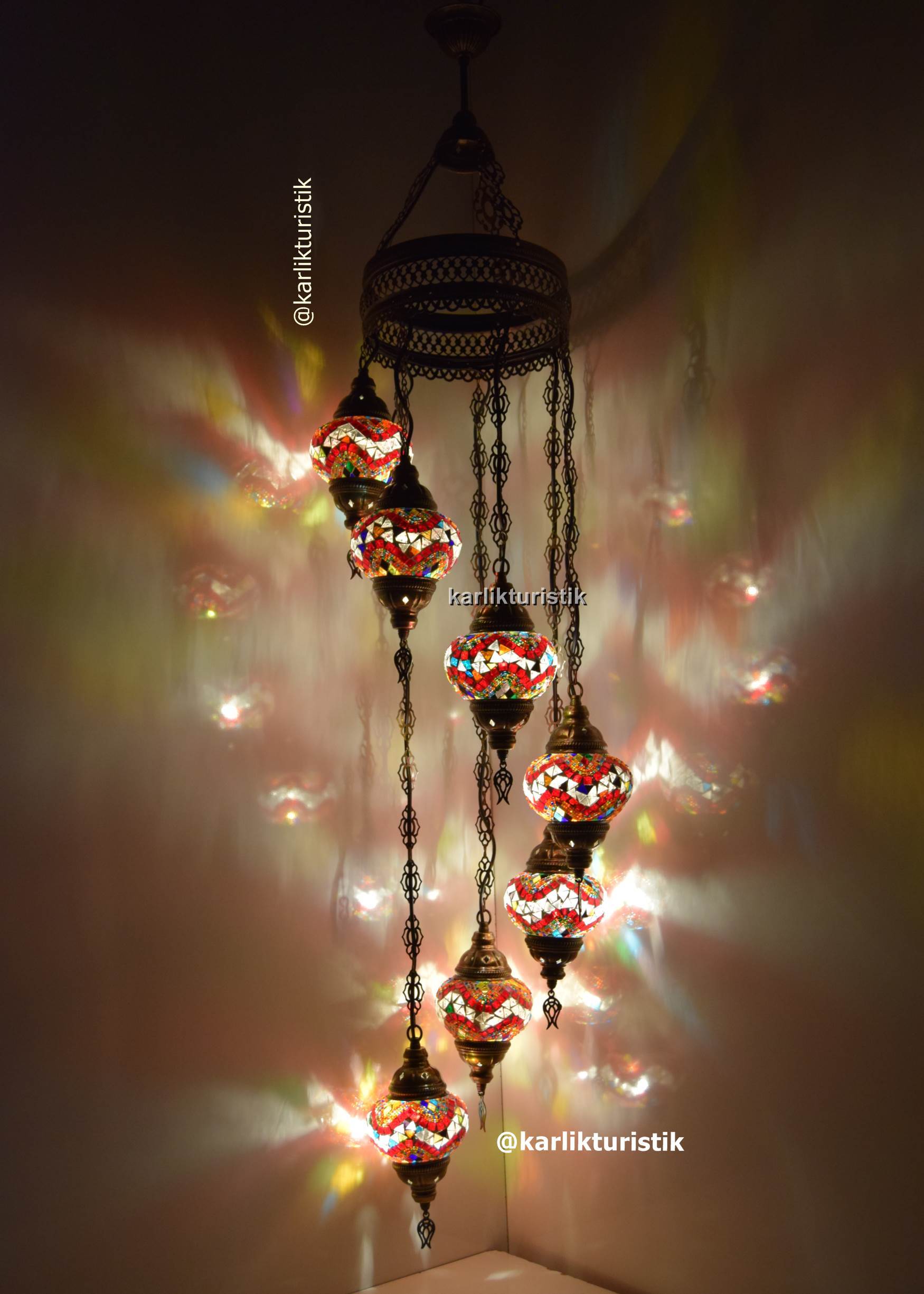 Türk Lambası 7 li mozaik camlı Tasarım avize, Türk Lambası Tavan Aydınlatması , Mozaik Lamba Askılı, Moracon Lamba, Türk Mozaik Tavan Avize Lambası I-S-C-5308